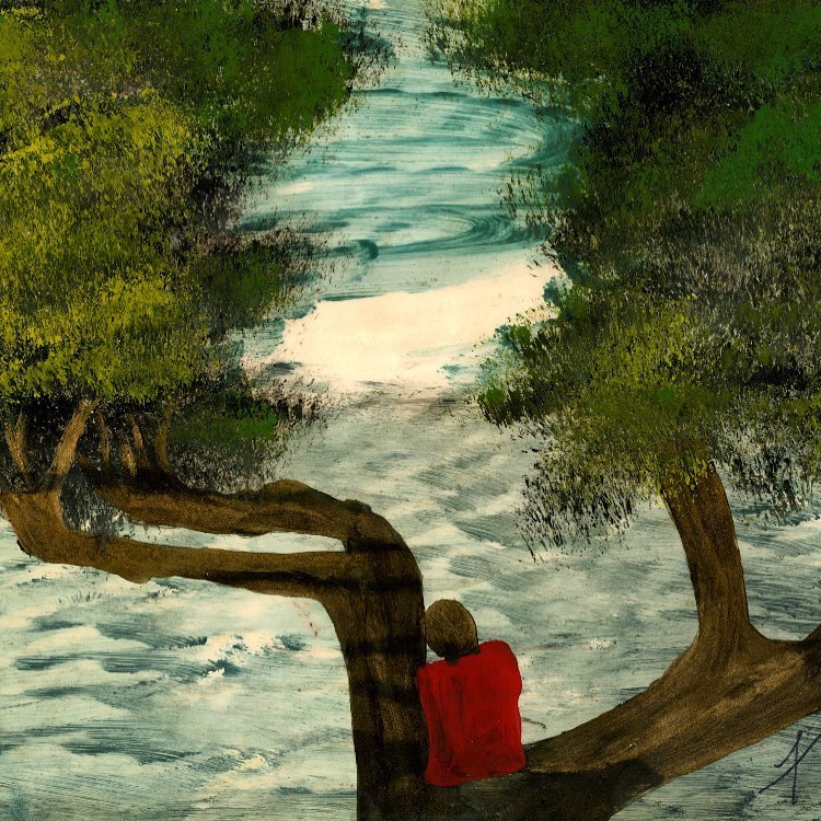 - Man in tree wearing red shirt – oil on photographic paper