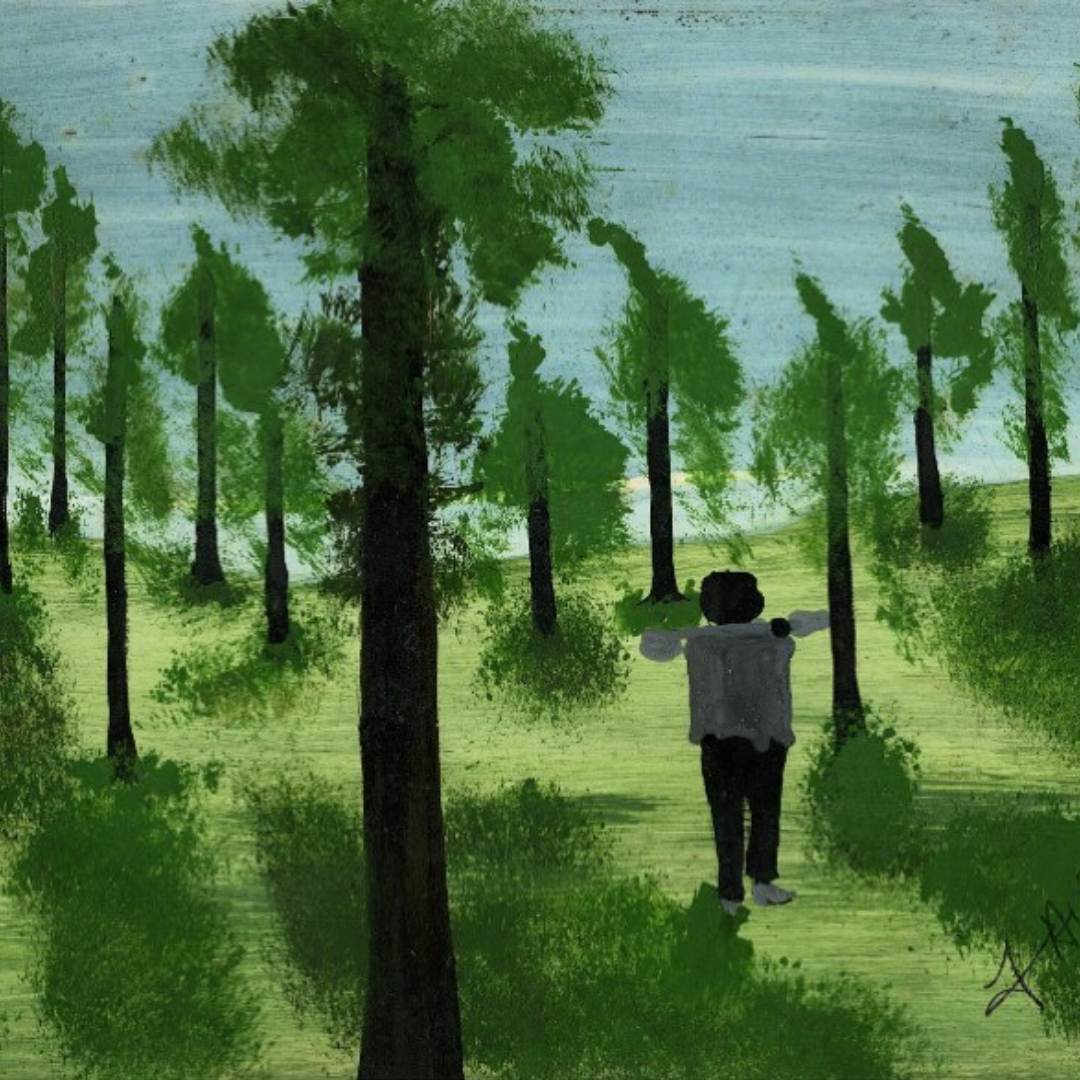 - Man in grey shirt walking among trees