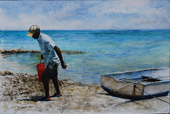 ‘Red Bucket II’ by Sheldon Saint. Watercolor on paper.